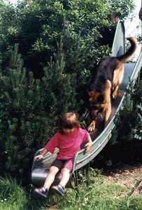 Our daughter Alexandra is eight years old now and also an animal lover. All of our dogs are part of the family and this implies that our vacuum cleaner is always busy. Alexandra’s favorite dog is "Flick" who spends most of his time in the house and patiently tolerates all of Alexandra’s jokes and tricks. These two are a truly great team. Alexandra already helps me taking care of the puppies and spends a lot of time in the whelping box with the mother and the newly born babies.