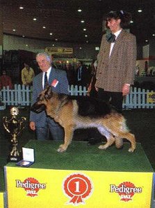 "Ulk von Arlett" stems from a combination of "Yago vom Wildsteiger Land" and "Dolly von Arlettt" a daughter of "Fedor von Arminius" that still has "Elke von der Rosenmatt" on her mothers side. "Ulk" was sold as an eight week old puppy to friends in Italy (Gianni and Angelo) and came back to Germany a lot later to be titled and trained. He was rated SG 25 on his first Siegerschau in 1991 and went back to his owners in Italy after that. In 1992 he came back to us and was rated V 7 on the Siegerschau which was a great achievement and success and we were all very happy about it. A few weeks after that Siegerschau I went to Italy to visit his owners and to ask them if they were willing to let us have the dog back, which luckily enough, they did and we are still grateful for that. So we got him back which we have never regretted for a single minute.