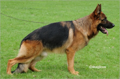 Groß, kräftig, sehr typ-und ausdrucksvoll, in richtigem Höhen- und Längenverhältnis aufgebaut. Hoher Widerrist, fester Rücken, sehr gute Länge und Lage der Kruppe, ausgeglichene Brustverhältnisse, korrekte Front. Hinten und vorne geradetretend ist das Gangwerk weit ausgreifend mit sehr freiem Vortritt und kraftvollem Nachschub. TSB ausgeprägt; läßt ab.