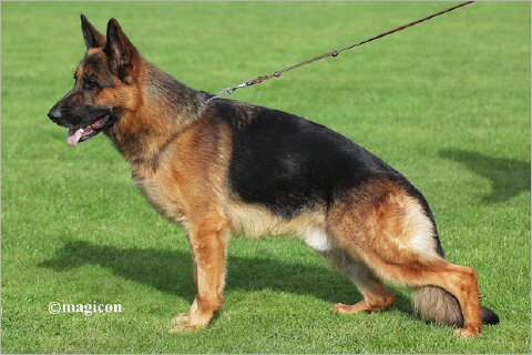 Großer, kraft- und gehaltvoller Rüde. Sehr guter Ausdruck, hoher Widerrist, fester Rücken, Kruppe zeigt sich leicht abschüssig und sollte geringfügig länger sein, gute Vorhand-, sehr gute Hinterhandwinkelungen, normale Brustverhältnisse, Ellenbogen noch nicht ganz geschlossen, gerade Front, bei noch nicht ganz gefestigten Sprunggelenken zeigt er kraftvolle Gänge mit wirksamem Nachschub und freiem Vortritt. Wesen sicher; TSB ausgeprägt.