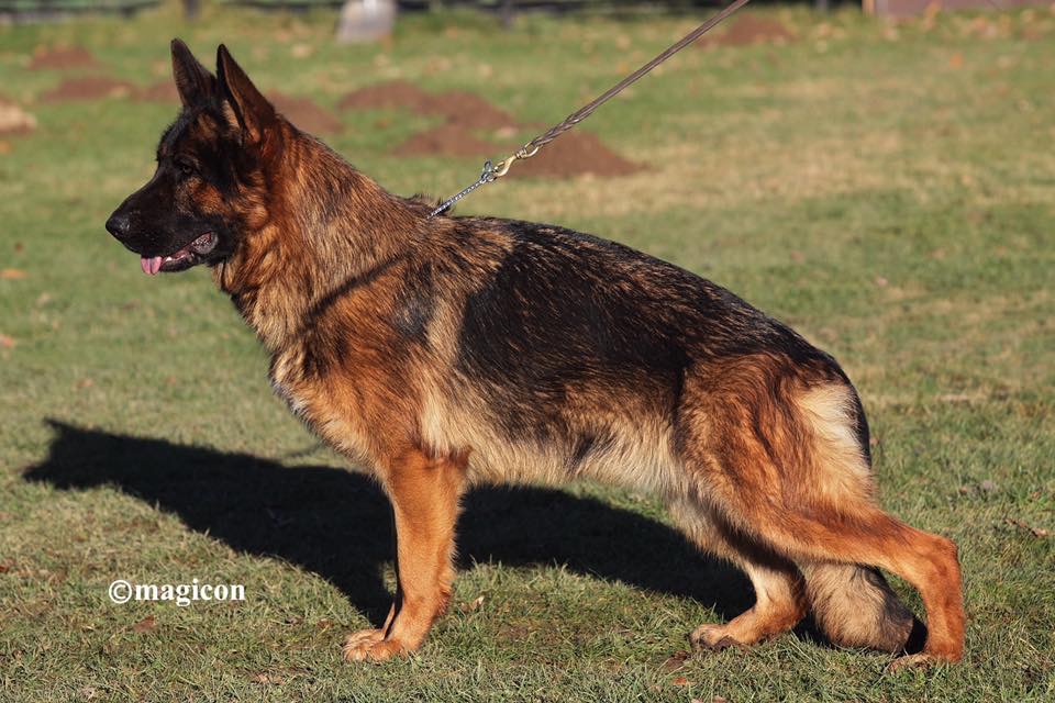 Groß, gestreckt, kraft- und gehaltvoll, kräftiger Kopf, hoher Widerrist, fester Rücken, gute Länge und Lage der Kruppe, sehr gute Winkelungen der Vor- und Hinterhand, ausgeglichene Brustverhältnisse, gerade Front, vorne gerade, hinten etwas eng tretend, sehr gute Gänge mit kraftvollem Nachschub und freiem Vortritt. Sicheres Wesen, TSB ausgeprägt.