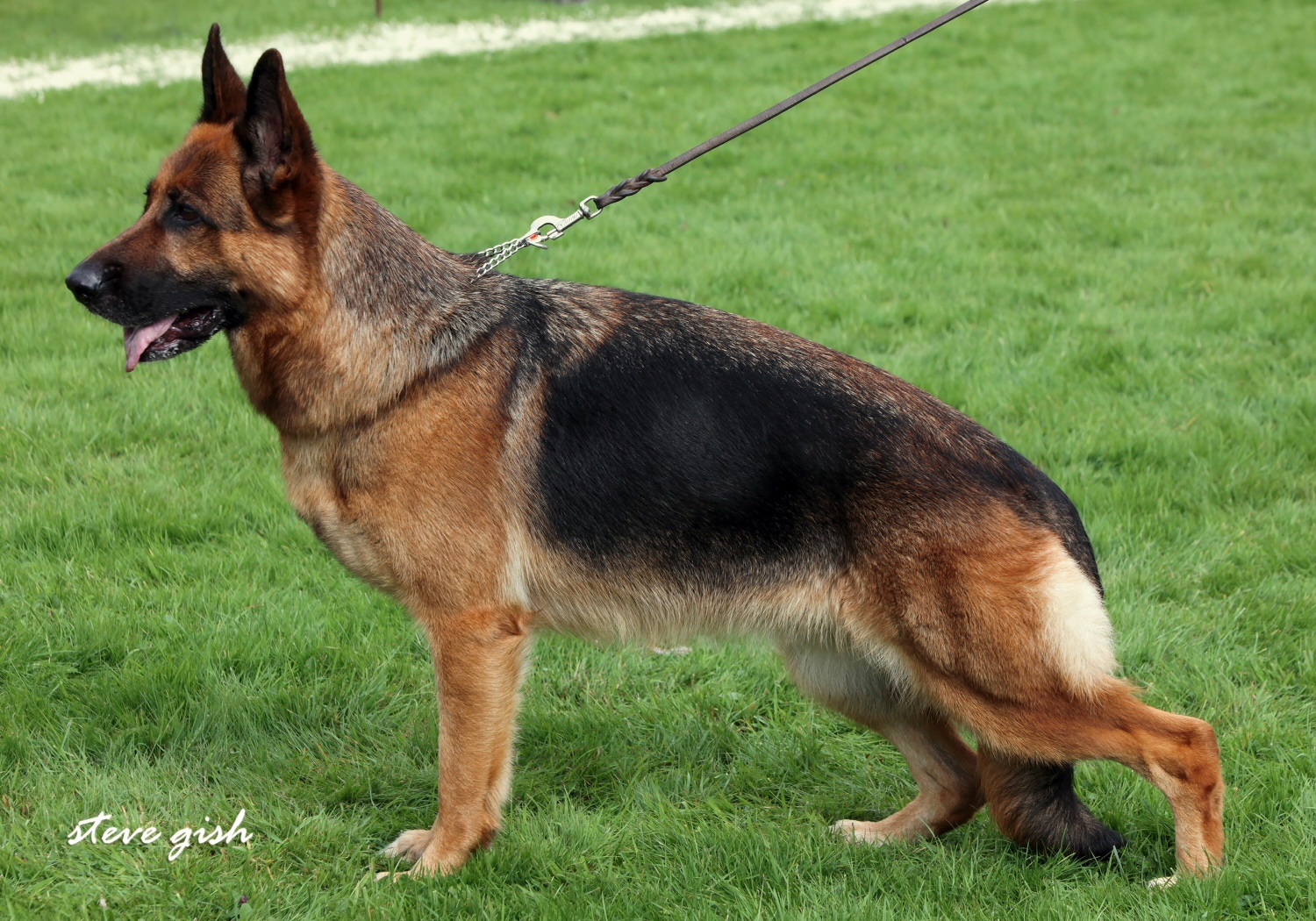 Groß, kraft-, gehaltvoll, imposante, ausdrucksvolle Gesamterscheinung, sehr gute Gesamtfestigkeit, sattes Pigment, einwandfreie Gebäudeverhältnisse, sehr gute Kopfproportionen, hoher Widerrist, sehr gute Ober- und Unterlinie, gute Länge und Lage der Kruppe, korrekte Winkelung der Vorhand, betont gewinkelte Hinterhand, feste Sprunggelenke, korrekte Front, kraftvoller, dynamischer Bewegungsablauf. Sicheres Wesen, TSB ausgeprägt; läßt ab.