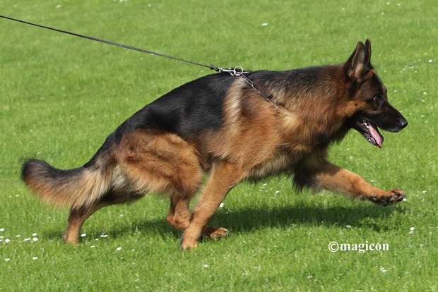 ausgeglichene Brustverhältnisse, gerade Front. Geradetretend, kraftvolle, raumgreifende Gänge mit freiem Vortritt bei sehr guter Erhabenheit. Sicheres Wesen, TSB ausgeprägt, lässt ab.