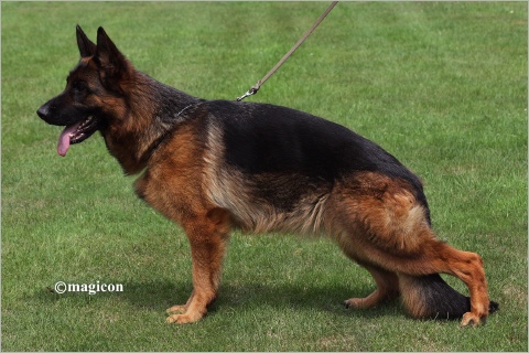 Große, sehr typ- und ausdrucksvolle Hündin, trocken und fest, harmonische Ober- und Unterlinie, korrekte Winkelungen der Vor- und Hinterhand, betont kraftvoller Nachschub und freier Vortritt ermöglichen sehr raumgewinnende Gänge. Sicheres Wesen, TSB ausgeprägt.