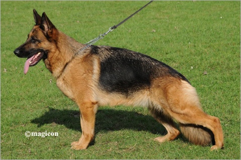 Übermittelgroß, mittelkräftig, typ-, ausdrucksvoll, trocken und fest, hoher Widerrist, gerader Rücken, gute Kruppe. Korrekte Winkelungen der Vor- und Hinterhand, ausgewogene Brustverhältnisse, gerade Front. Geradetretend zeigt sie sehr fließende, kraftvolle, raumschaffende Gänge. Sicheres Wesen, TSB ausgeprägt; läßt ab.