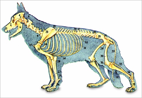 13. Brustbeinanfang 14. Brustbeinende 15. Dritter Brustwirbel 16. Dreizehnter Brustwirbel 17. Erster Lendenwirbel 18. Siebter Lendenwirbel 19. Kreuzbein 20. Schwanzwirbel 21. Schulterblatt 22. Oberarm 23. Speiche 24. Elle (23 und 24 bilden gemeinsam den Unterarm) |
