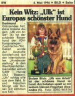 Dortmund - Glänzendes Fell, klare braune Augen: "Ulk von Arlett" (6) ist der schönste Rassehund der VDH-Europasieger-Zuchtschau `96! Gekürt wurde der Deutsche Schäferhund auf der internationalen "Hundeausstellung" in den Westfalenhallen. Gemeldet waren 5.809 Hunde (242 Rassen). "Ulk" schlug alle aus dem Feld. Er und Frauchen Margit van Dorssen (42) kommen aus Köln.