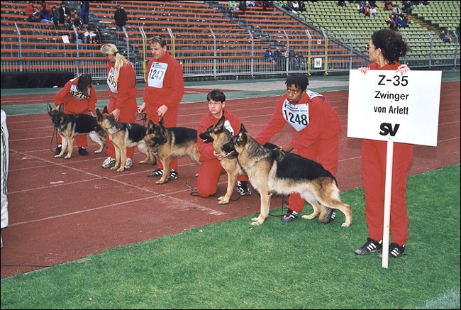 Auch Frau van Dorssen nimmt seit Jahren sehr erfolgreich an diesem Wettbewerb teil. Gezeigt wird eine Gruppe mit höchstem Schwierigkeitsgrad, sehr guter Einheitlichkeit mit auffallend gutem Typ sowie hoher Qualität der Einzeltiere. Hervorzuheben ist, daß drei Tiere in der Gebrauchshundklasse vorgestellt werden. Das Übergewicht liegt bei den Rüden. |