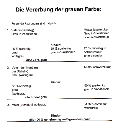 Paart man eine schwarz-braune Hündin mit einem grauen Rüden, so fallen im Mittel 50 % graue und 50 % schwarz-braune Welpen.