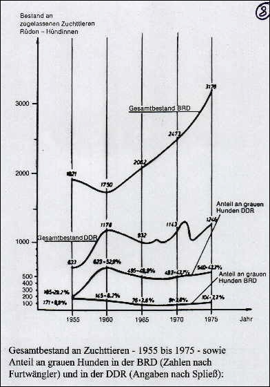 Dieses Diagramm zeigt den Gesamtbestand an Zuchttieren in einem Zeitraum von 20 Jahren sowie deren Anteil an grauen Hunden. Auffällig hier der Vergleich zwischen BRD und damals noch der DDR.