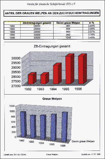 Diese Aufschlüsselung zeigt den Anteil der grauen Welpen an den Zuchtbucheintragungen der vergangenen 5 Jahre. Auch wenn hier prozentual ein ganz leichter Anstieg zu verzeichnen ist, sind die absoluten Zahlen doch äußerst gering. Gegenüber 1992 wurden 1996 lediglich ca. 80 graue Welpen mehr eingetragen. (Bei diesen Zahlen ist allerdings zu berücksichtigen, daß sie erstellt wurden über die Farbangabe "grau". Die Varianten in grau sind hier nicht berücksichtigt, diese Zahlen sollen aber in absehbarer Zeit aktualisiert werden.)