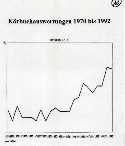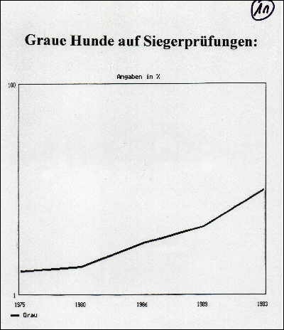 Dieses Kurvendiagramm zeigt die Anzahl der grauen Hunde, die auf Körungen von 1970 bis 1992 vorgeführt wurden. Der enorme Anstieg von 1990 bis 1991 ist - so denke ich - auf die Öffnung der Mauer zurückzuführen. Auch auf dem Höchststand liegt diese Zahl immer noch unter 20 %. Im Mittel liegt die Zahl der grauen Hunde auf Körungen bei ca. 5 %.
