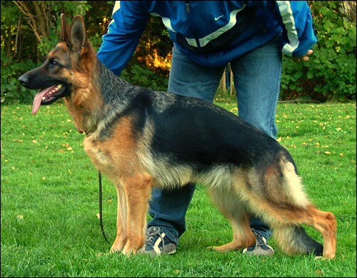 Übermitteigroß, mittelkräftig, substanzvoll, gefügefest, beeindruckend im Exterieur, kräftig pigmentiert, formschöner Kopf mit lebensvollem Ausdruck, hoher, langer Widerrist, gerader Rücken, lange, sehr gut gelagerte Kruppe, ausgewogene Brustbildung, gute Front, korrektes Trittsiegel, freie, bodendeckende Gänge mit wirksamer Rückenübertragung. Nervenfest, TSB ausgeprägt. |