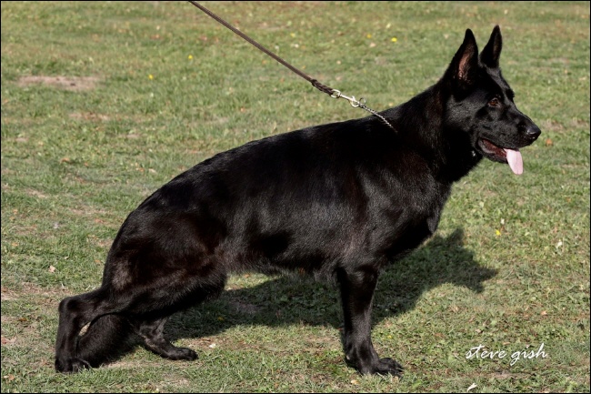 Übermittelgroß, mittelkräftig, gehaltvoll. Ausdrucksvoller Kopf mit dunklem Auge, hoher Widerrist, gerader, fester Rücken, lange, leicht abschüssige Kruppe, sehr gute Winkelungen, ausgeglichene Brustverhältnisse. Korrekte Front, gerade Schrittfolge, kraftvolles, weit ausgreifendes Gangwerk. Sicheres Wesen, TSB ausgeprägt. |