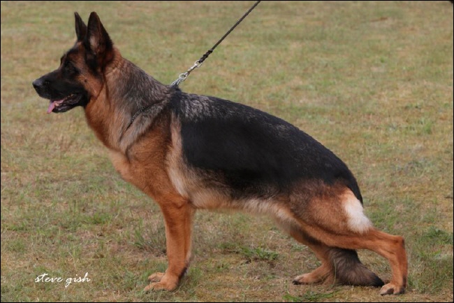 Groß, mittelkräftig, typ- und ausdrucksvoll, sehr gute Gebäudeverhältnisse. Hoher Widerrist, fester Rücken, gute Kruppe, korrekte Winkelungen de Vor- und Hinterhand. Ausgeglichene Brustverhältnisse, gerade Front, hinten etwas eng, vorne gerade tretend, fließende, kraftvolle, weit ausgreifende Gänge. Sichers Wesen; TSB ausgeprägt. |