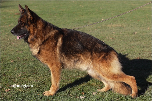 Großer, ausdrucksvoller, gehaltvoller,trockener und fester Rüde mit korrekten Gebäudeverhältnissen. Hoher Widerrist, gerader Rücken, lange, leicht abschüssige Kruppe, korrekte Winkelungen, ausgeglichene Brustverhältnisse, gerade Front. Hinten und vorne gerade tretend, ausgreifende Gänge mit freiem Vortritt und wirksamen Nachschub. Wesen sicher, TSB ausgeprägt. |