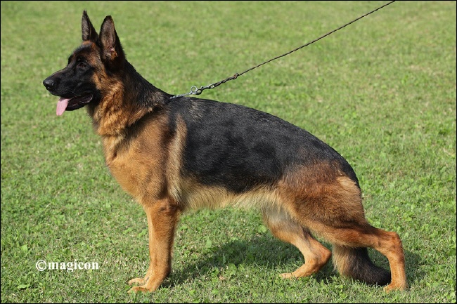 Groß, gehaltvoll, mittelkräftig, trocken und fest, gestrckt, guter Ausdruck, gut pigmentiert, feminin. Hoher, langer Widerrist, gerader, fester Rücken, gute Länge und Lage der Kruppe. Vorne gut, hinten sehr gut gewinkelt, ausgeglichene Brustverhältnisse, gerade Front. Gerade tretend, sehr kraftvolle, sehr raumgreifende Gänge. Sicheres Wesen, TSB ausgeprägt. |