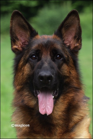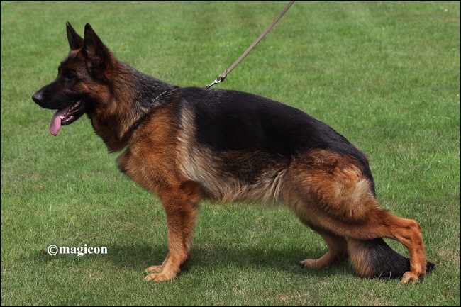 Große, sehr typ- und ausdrucksvolle Hündin, trocken und fest, harmonische Ober- und Unterlinie, korrekte Winkelungen der Vor- und Hinterhand, betont kraftvoller Nachschub und freier Vortritt ermöglichen sehr raumgewinnende Gänge. Sicheres Wesen, TSB ausgeprägt. |