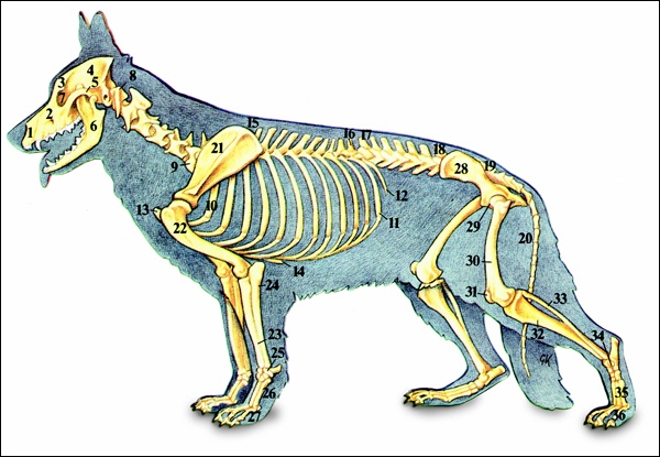 1. Zwischenkieferbein 2. Oberkieferbein 3. Stirn 4. Hirnschädel 5. Jochbogen 6. Unterkiefer 7. Augenhöhle 8. Erster Halswirbel 9. Sechster Halswirbel 10. Erste Rippe 11. Zwölfte Rippe 12. Fleischrippe = 13. Rippe |
