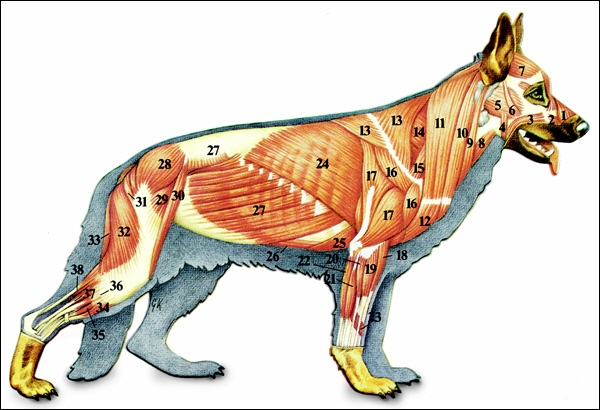 1. Oberlippenheber 2. Kiefernasenmuskel 3. Lippenschließmuskel 4. Backenmuskel 5. Äußerer Kaumuskel 6. Jochmuskel 7. Schläfenmuskel 8. Brustzungebeinmuskel 9. Niederzieher der Ohrmuschel 10. Brustbein-Kopfmuskel 11. Schlüsselbein-Halsmuskel 12. Schlüsselbein-Oberarmmuskel 13. Trapezmuskel |