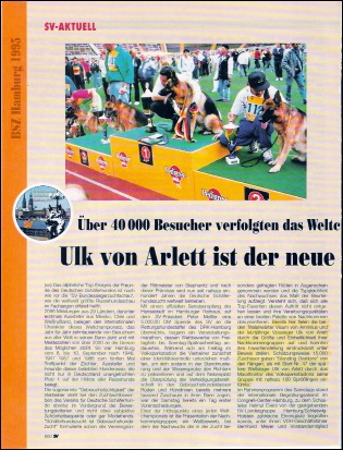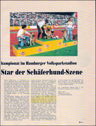 (vo) Das alljährliche Top-Ereignis der Freunde des Deutschen Schäferhundes ist nach wie vor die "SV-Bundessiegerzuchtschau", wie die weltweit größte Rassehundeschau im Fachjargon offiziell heißt. 2096 Meldungen aus 29 Ländern, darunter erstmals Aussteller aus Mexiko, Chile und Weißrußland, belegen den internationalen Charakter dieses Weltchampionats, das Jahr für Jahr zehntausende von Besuchern aus aller Welt in seinen Bann zieht und mit Meldezahlen von über 2000 an die Grenze des Möglichen stößt. So war Hamburg vom 8. bis 1O. September nach 1946, 1947 1957 und 1986 zum fünften Mal Treffpunkt der Züchter, Aussteller und Freunde dieser beliebten Hunderasse, die nicht nur in Deutschland unangefochten Platz 1 auf der Hitliste aller Rassehunde belegt. Die sogenannte "Gebrauchstüchtigkeit" der Vierbeiner steht bei den Zuchtwettbewerben des Vereins für Deutsche Schäferhunde absolut im Vordergrund der Bewertungskriterien und nicht etwa subjektive Schönheitsaspekte oder gar Modetrends. "Schäferhundezucht ist Gebrauchshundezucht" formulierte schon der Vereinsgründer Rittmeister von Stephanitz und nach dieser Prämisse wird nun seit nahezu einhundert Jahren die Deutsche Schäferhundezucht weltweit betrieben. Mit einem offiziellen Senatsempfang der Hansestadt im Hamburger Rathaus, auf dem SV-Präsident Peter Meßler eine 5.000,00 DM Spende des SV an die Rettungshundestaffel des DRK-Hamburg überreichte, begann ein Veranstaltungsmarathon, dessen Wettbewerbe von Freitagfrüh bis Sonntag-Spätnachmittag andauerten. Während sich am Freitag im Volksparkstadion die Vierbeiner zunächst einer Identitätskontrolle unterziehen mußten, um sich sodann in der Standmusterung und der Wesensprobe den Richtern zu präsentieren und auf dem Nebenplatz die Überprüfung der Verteidigungsbereitschaft in den Gebrauchshundeklassen Rüden und Hündinnen bereits mehrere tausend Zuschauer in ihren Bann zogen, war der Samstag bereits ein Tag erster Vorentscheidungen. Einer der Höhepunkte eines jeden Weltchampionats ist die Präsentation der Nachkommengruppen; ein Wettbewerb, bei dem der Nachwuchs der in der Zucht besonders gefragten Rüden in Augenschein genommen werden und die Typgleichheit des Nachwuchses das Maß der Beurteilung aufzeigt. Versteht sich, daß sich alle Top-Favoriten diesen Auftritt nicht entgehen lassen und ihre Vererbungsqualitäten an einer breiten Palette von Nachkommen dokumentieren. Bereits hier fielen die beiden Titelanwärter Visum von Arminius und der letztjährige Vizesieger Ulk von Arlett durch die Größe und Einheitlichkeit ihrer Nachkommengruppen auf und konnten ihre Favoritenstellung eindrucksvoll unter Beweis stellen. Schätzungsweise 15.000 Zuschauer gaben "Standing Ovations" von den Rängen, als mit Start-Nr. 47 der spätere Weltsieger Ulk von Arlett durch das Marathontor des Volksparkstadions seine Gruppe mit nahezu 100 Sprößlingen anführte. Im Rahmenprogramm des Samstags stand der internationale Begrüßungsabend im Congreß-Center-Hamburg, zu dem Schauleiter Helmut Evers von der gastgebenden SV-Landesgruppe Hamburg/Schleswig-Holstein zahlreiche Ehrengäste begrüßen konnte, unter ihnen VDH-Geschäftsführer Bernhard Meyer und Vorstandsmitglied Hanns Wiblishauser in Vertretung des VDH-Präsidenten Uwe Fischer, der erst am Sonntag nach Hamburg kommen konnte. Besondere Grüße galten dem Präsidenten der Weltunion der Vereine für Deutsche Schäferhunde WUSV und VDH-Vizepräsident Hermann Martin, zugleich Ehrenpräsident des SV, sowie dem für HD Auswertungsverfahren zuständigen Dr. Wilhelm Brass von der Universität Hannover. Mit besonderem Applaus der ca. 2000 Gäste wurde die TV-Präsentation vierbeinigen Medienstars "Kommissar aus der gleichlautenden SAT1 Fernsehserie bedacht, der eigens zur SV-Pressekonferenz nach Hamburg gekommen und wie es einem Star gebührt. Trainerin Ann Theresa Miller für Medienrummel und ein großes Aufgebot Journalisten gesorgt hatte. Gerhard Bona sorgte in professioneller Manier die Moderation dieses Beitrages, mit Rex alias "Sambo vom Haus Zieglmayer" und seinem Züchter Zieglmayer aus dem bayerischen Rottenburg einen Vierbeiner aus besten SV-Zuchtlinien präsentieren konnte. Seinen absoluten Höhepunkt erlebte das Weltchampionat 1995 am Sonntagnachmittag mit der Endphase des Richtens in den beiden Gebrauchshundeklassen. Nochmals 20.000 Besucher sorgten für eine bundesligataugliche Kulisse, die engagiert alle Phasen des Finish's mitverfolgten und mit Applaus, aber auch mit Mißfallensäußerungen nicht geizten, wenn Richterentscheidungen nicht die ungeteilte Zustimmung des sachkundigen Publikums fanden. Gegen 16 Uhr schließlich stand der neue Champion fest: Ulk von Arlett, gezüchtet und im Eigentum von Margit van Dorssen aus Köln, ist der neue Star der internationalen Schäferhunde-Welt, gefolgt von Visum von Arminius (Züchter Hermann Martin, Viernheim) und Cash vom Wildsteiger Land (Züchter Martin Göbl, Wildsteig). Insgesamt 10 mal vergab SV-Präsident Peter Meßler die Höchstbewertung "Vorzüglich Auslese" und 135 weitere Top-Athleten konnten sich mit dem Prädikat "Vorzüglich" schmücken. Den Abschluß der Wettbewerbe bildete traditionell der Zuchtgruppen-Wettstreit, den Martin Göbl (Wildsteig/Oberammergau) mit seinem Zwinger "vom Wildsteiger Land" vor dem Zwinger "von der Noriswand" von Ernst Rückert aus Aschaffenburg und Friedrich Stenner (Hemer) mit dem Zwinger "von der Urbecke" gewann. (Ein ausführlicher Bericht folgt in der Dezember-Ausgabe der SV-Zeitung)